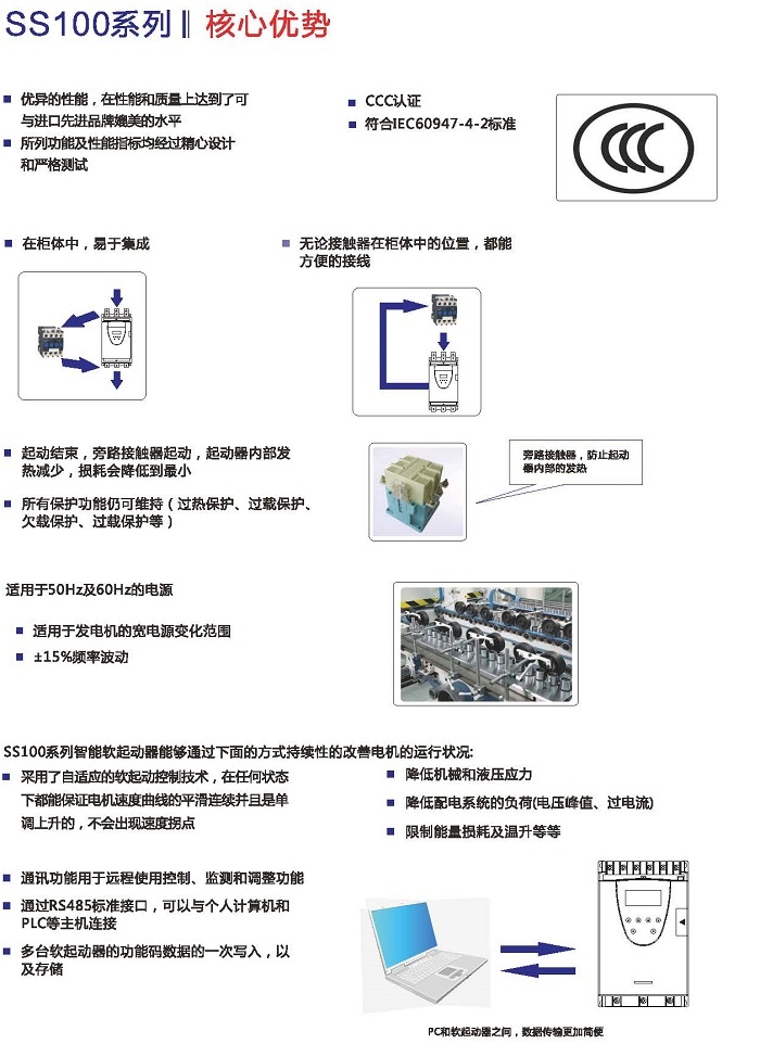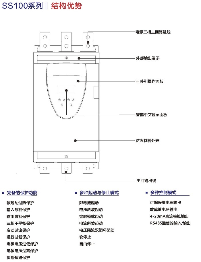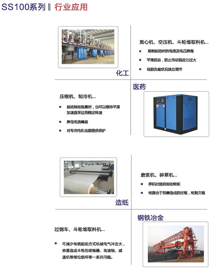 SS100智能软起动器是我公司自主研发的、采用电力电子技术,微处理技术及现代控制理论而设计生产的具有当今国际先进水平的起动设备。该产品能有效地限制交流异步电动机起动时的起动电流,可广泛应用于风机、水泵、输送类及压缩机等负载,是传统的星/三角转换、自耦降压、磁控降压等降压设备的理想换代产品。